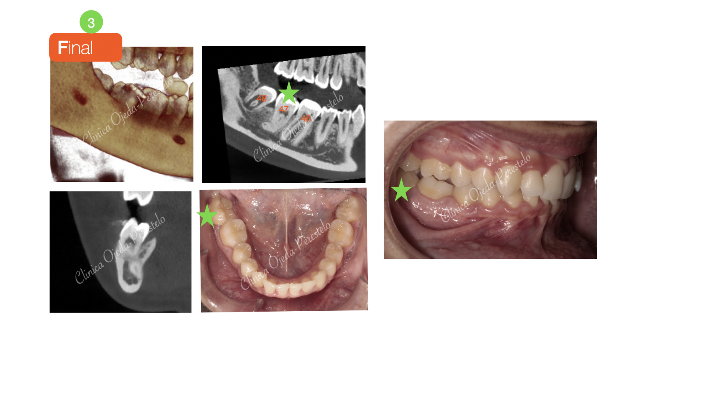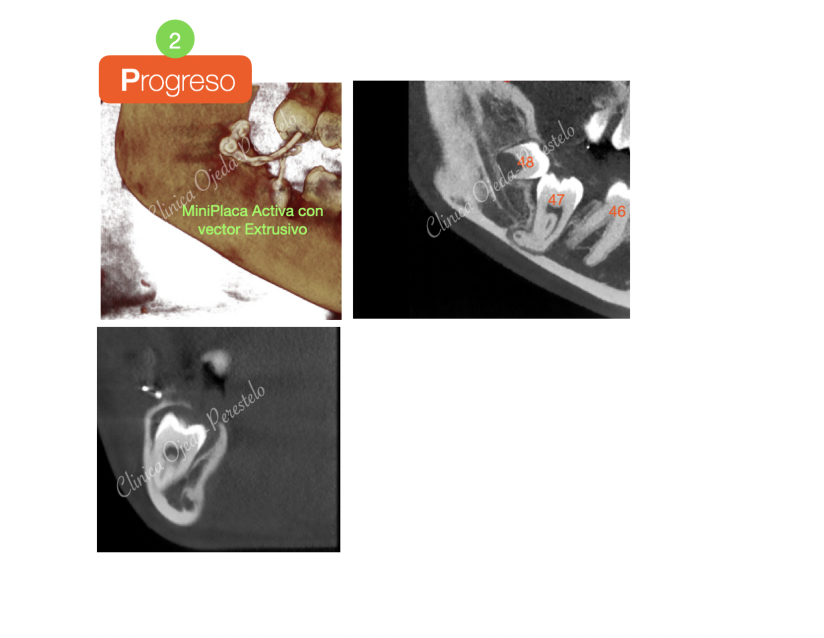 Podemos observar cómo hemos podido reconducir la pieza 47 al plano de oclusión de manera exitosa en un plazo de 15 meses tras la colocación de una Miniplaca semiactiva con tracción ortodoncia continuada. Actualmente la paciente está en fase de comenzar su tratamiento de Ortodoncia Plástica a efectos de poder mejorar la alineación, nivelación y la articulación de sus piezas dentarias.