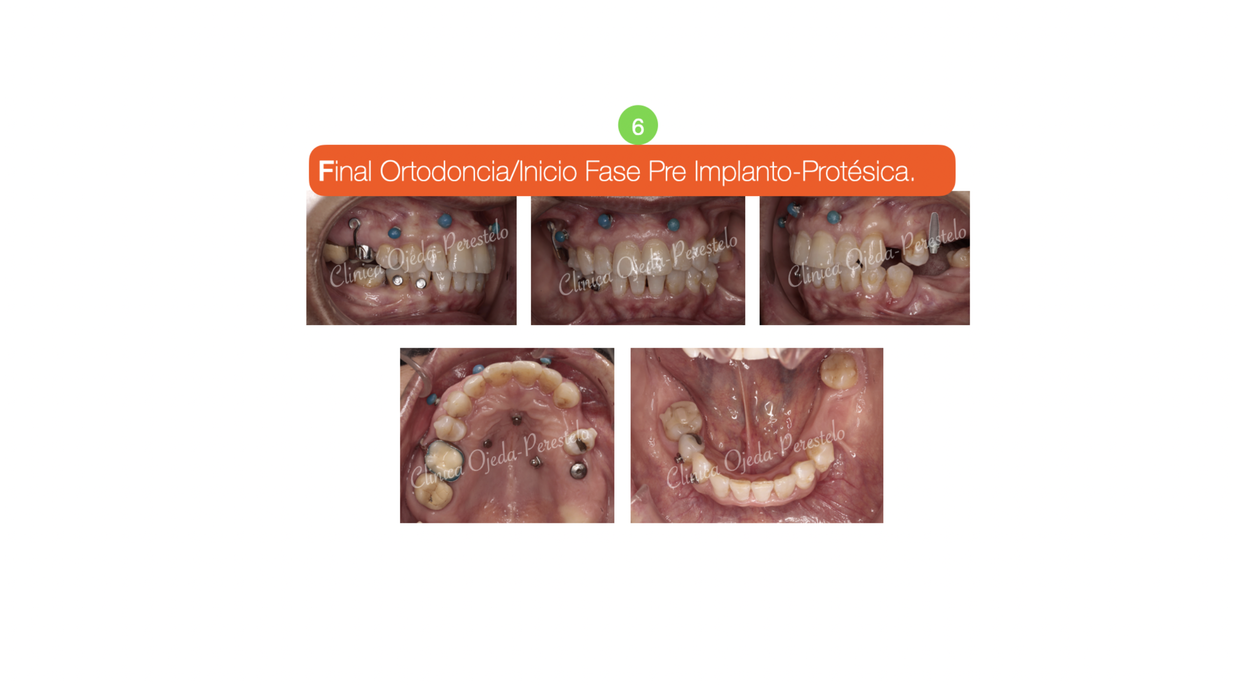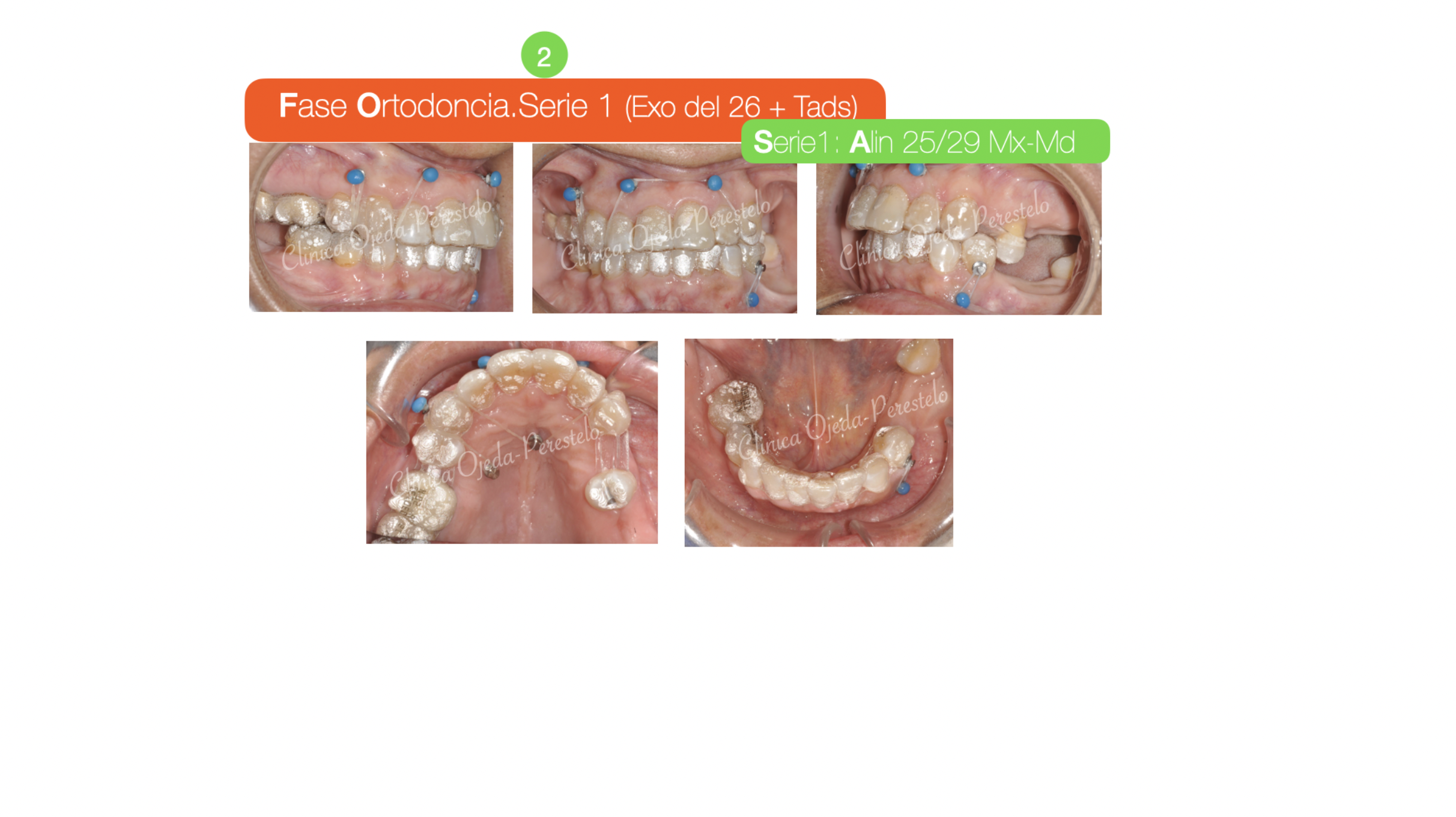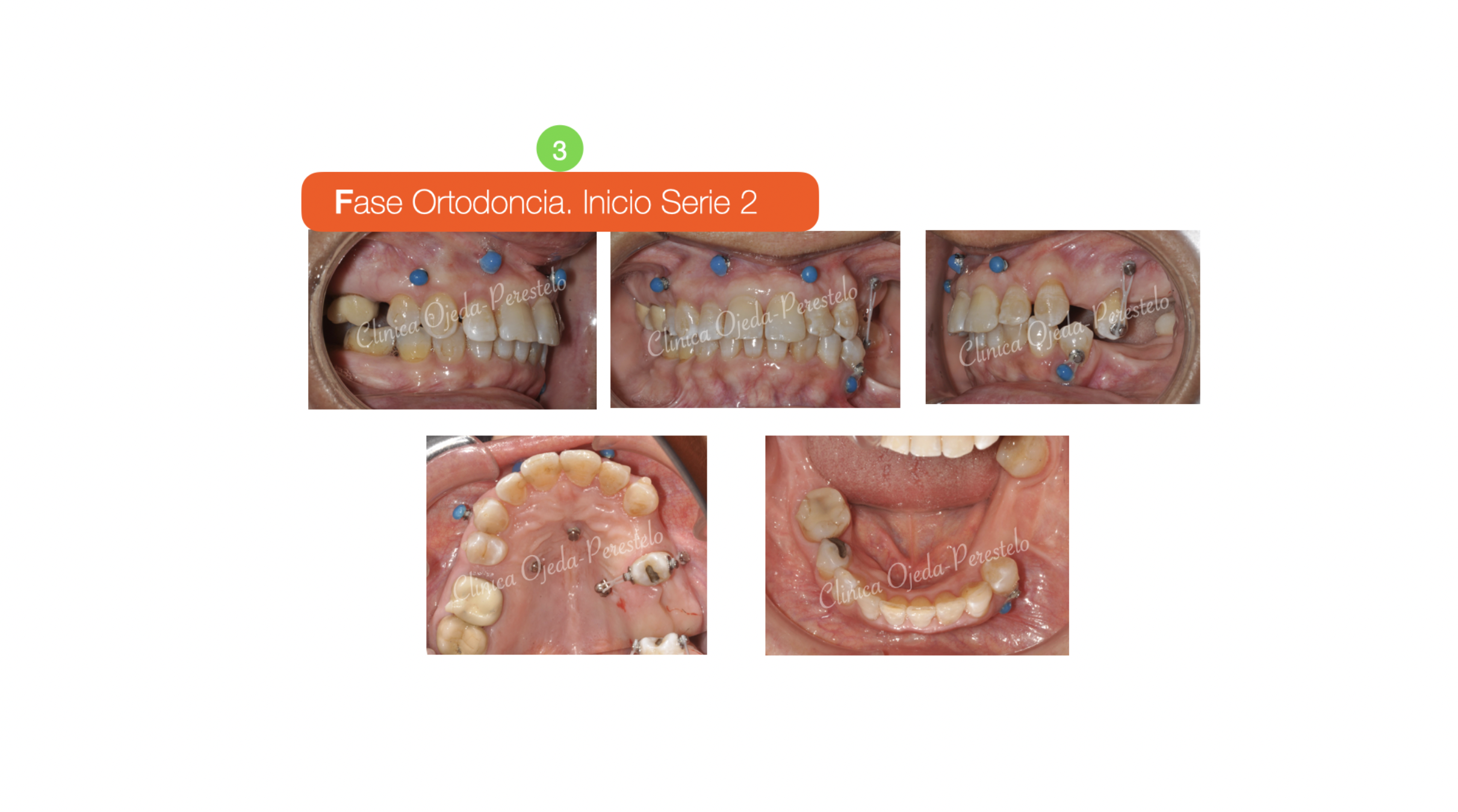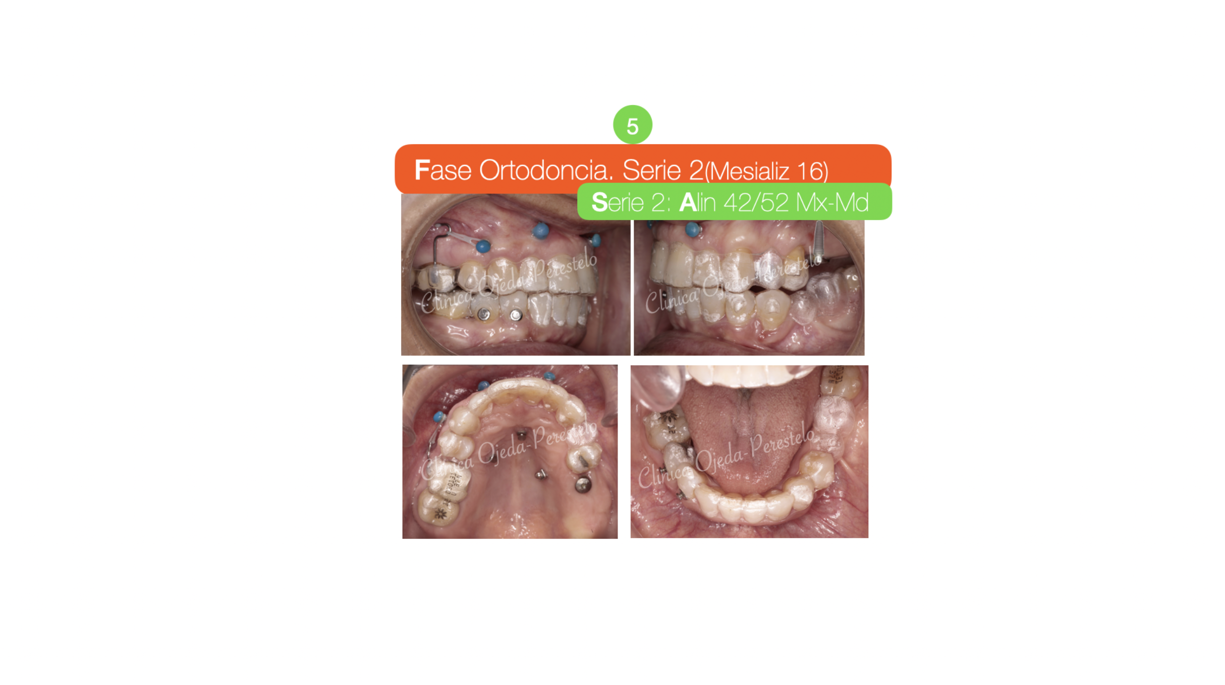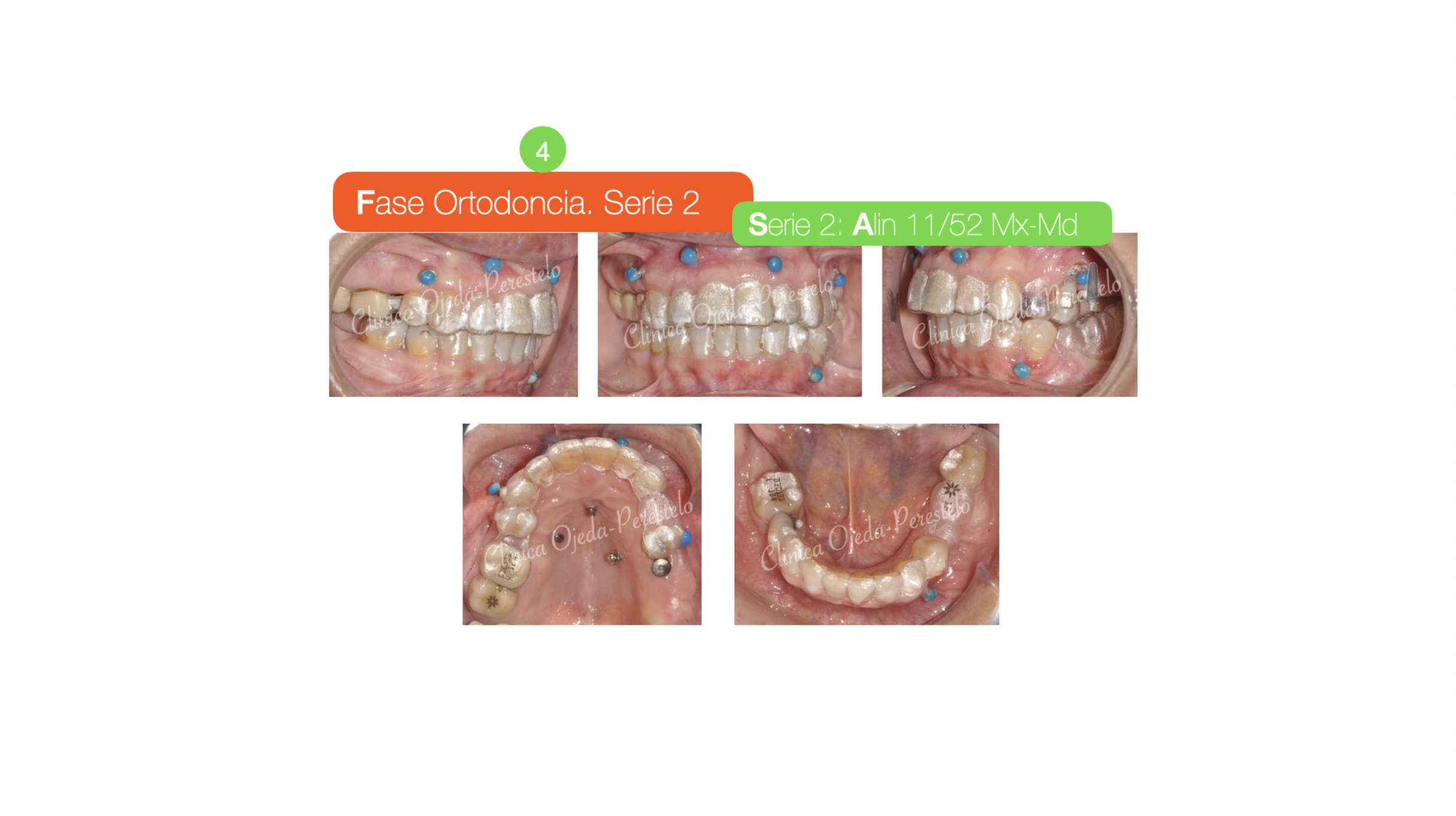 El objetivo de la etapa ortodóncica no era otro que alinear y nivelar sus arcadas dentarias y adecuar los espacios para la colocación (futura) de implantes y pónticos. Al tratarse de una paciente con limitación de apertura y el plano Maxilar inclinado y descendido en el lado derecho, se decidió combinar alineadores transparentes (Sistema Invisalign) con Microtornillos estratégicamente colocados.