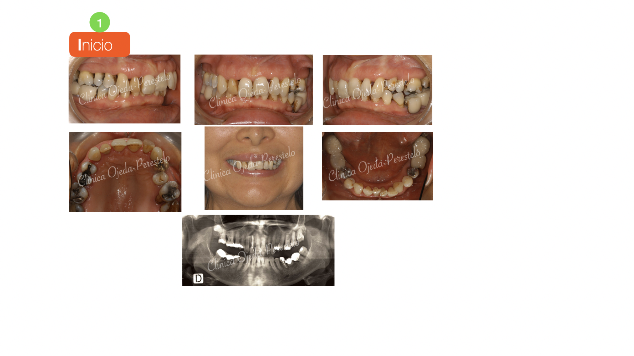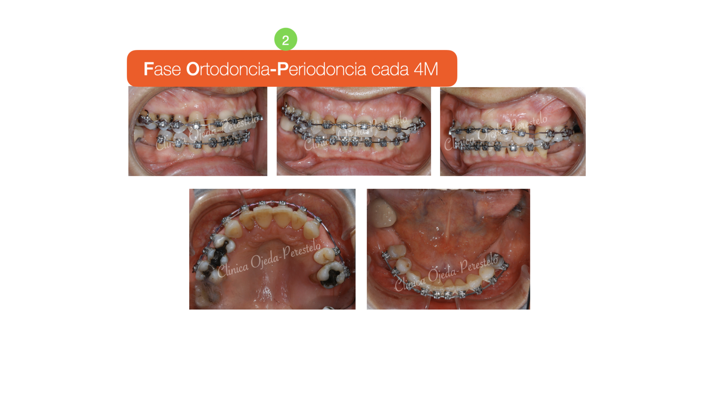 La rehabilitación oral completa en los pacientes adultos requiere en algunas ocasiones de planes de tratamiento bien coordinados entre las diferentes disciplinas odontológicas. Presentamos un caso que tras la fase de higienización periodontal, comenzó su tratamiento de Ortodoncia con brackets. El objetivo de la etapa ortodóncica no era otro que alinear y nivelar sus arcadas dentarias en todas aquellas piezas con soporte radicular y adecuar los espacios para la colocación (futura) de implantes y pónticos. Al tratatarse de una paciente con enfermedad periodontal y pérdida ósea es crítico implementar un sistema de fuerzas ortodóncias leves (Sistema Damon). La paciente ha de acudir a sus controles periodontales cada 4 meses durante la fase ortodóncica. (Dr Andrés García)