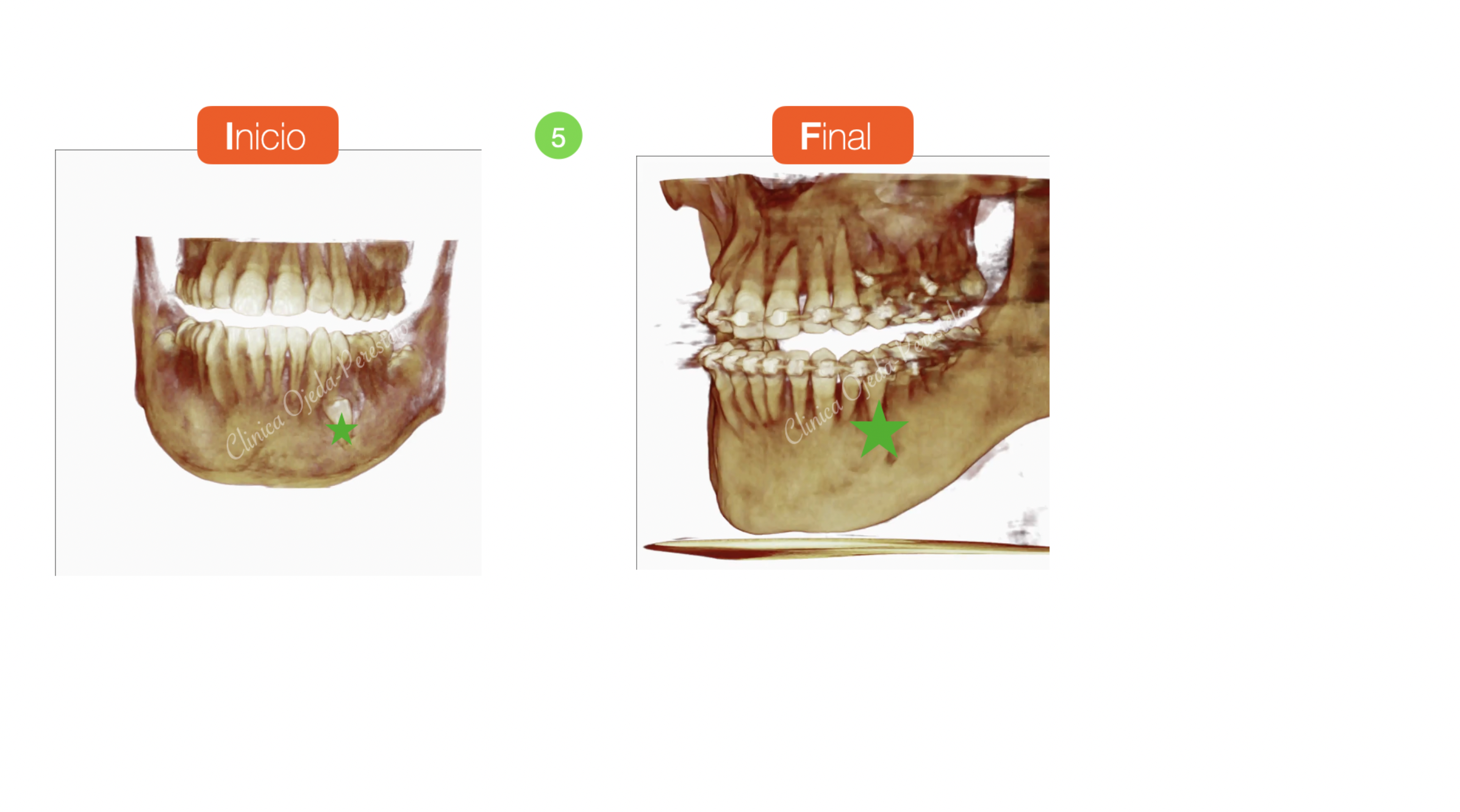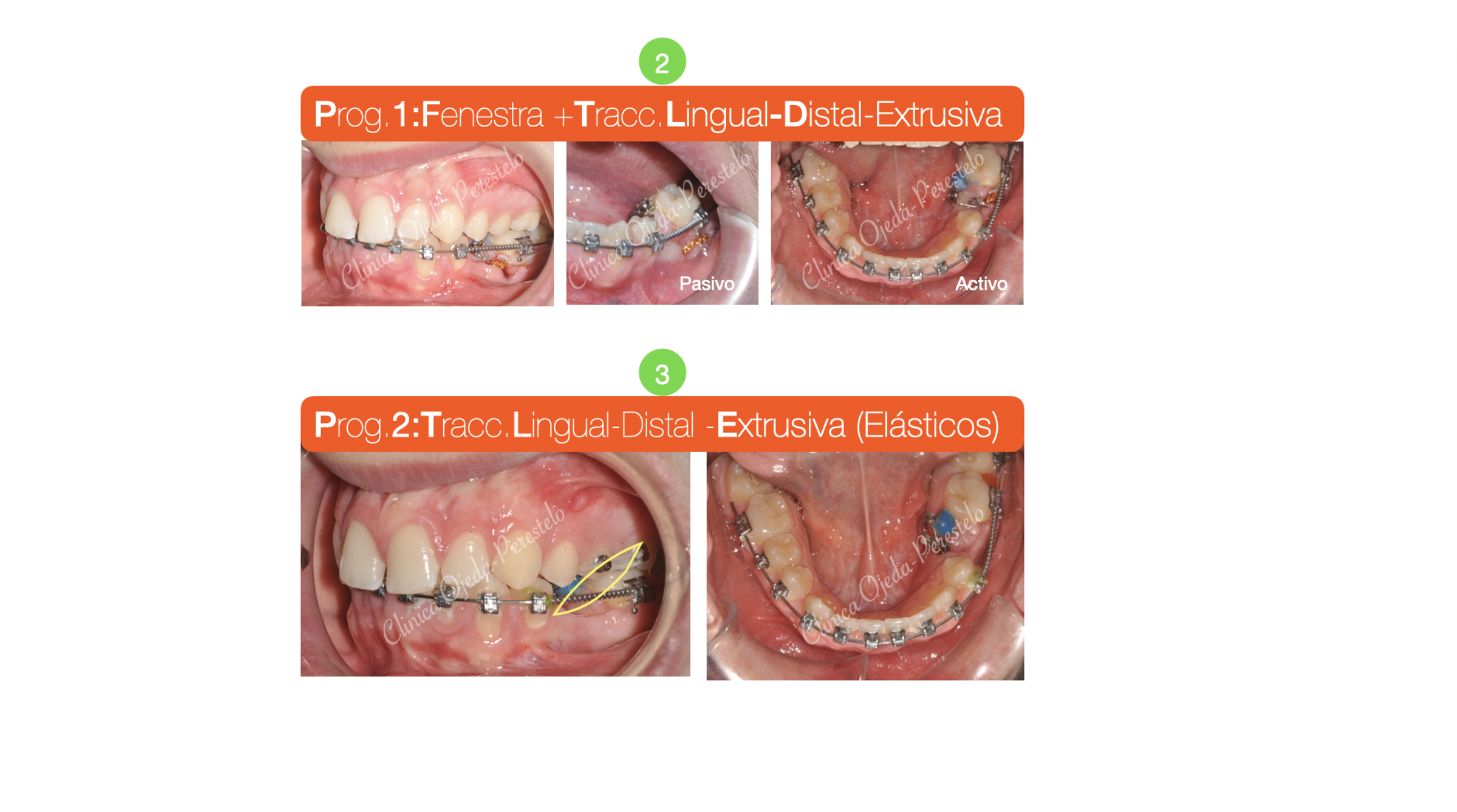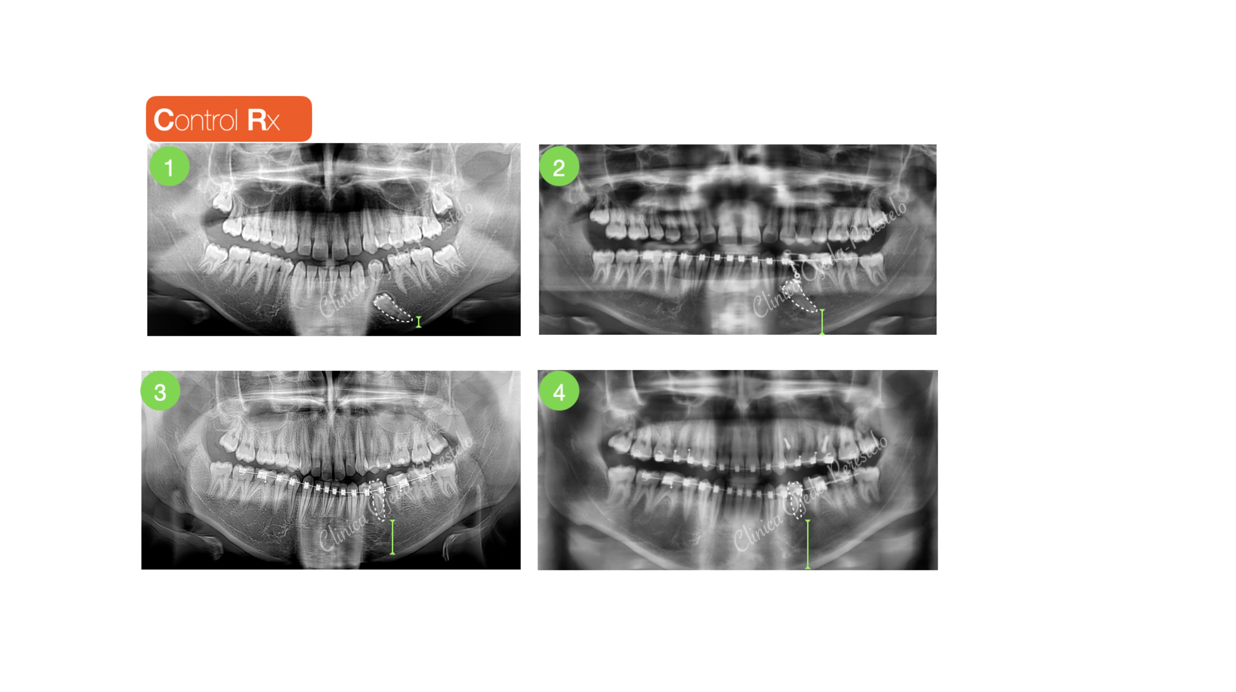 Su estudio detallado nos confirma que se encuentran próximo al borde mandibular y por la cara vestibular. Decidimos fenestrarlo e implementar una combinación de vectores extrusivo-distal y lingual hasta su correcta reubicación dentro de la arcada utilizando como anclaje 1MT con un resorte fabricado a medida. Este protocolo nos permite proteger de posibles reabsorciones radiculares a los dientes de apoyo.